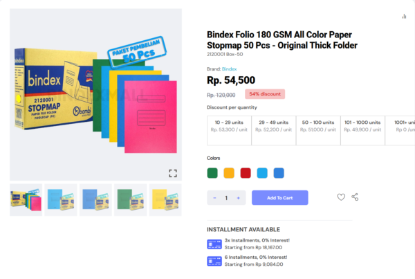 Pilih produk (Ordner, Clipboard, Box File, Ring Binder, dll), lalu tentukan warna dan jumlah produk yang ingin anda beli. Selanjutnya, klik “Tambahkan ke Keranjang” jika ingin menambahkan produk lain atau klik “Beli Sekarang” untuk langsung melakukan proses pembayaran. Ada diskon lagi untuk anda yang melakukan pembelian wholesale di Bindexmall.