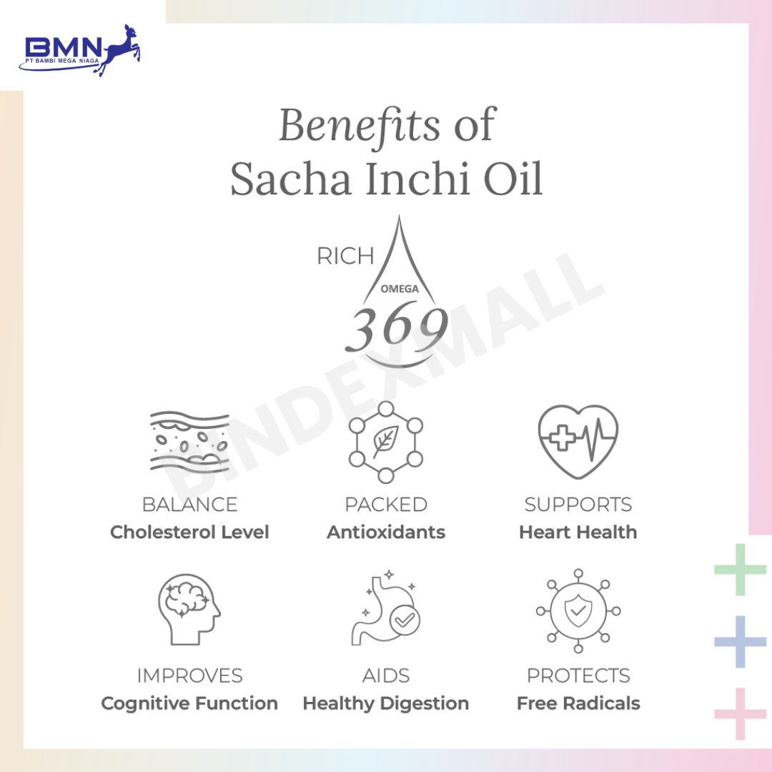 Minyak Sacha Inchi dikenal kaya akan omega 3, 6, dan 9. Kombinasi ini membantu mendukung fungsi tubuh secara menyeluruh. Omega 3 dan 6 berperan penting dalam mendukung fungsi otak, sehingga Anda dapat tetap fokus dan konsentrasi dalam menjalani aktivitas harian. Kemudian, kandungan lemak sehat ini juga turut membantu menjaga kesehatan sendi agar tetap nyaman bergerak.