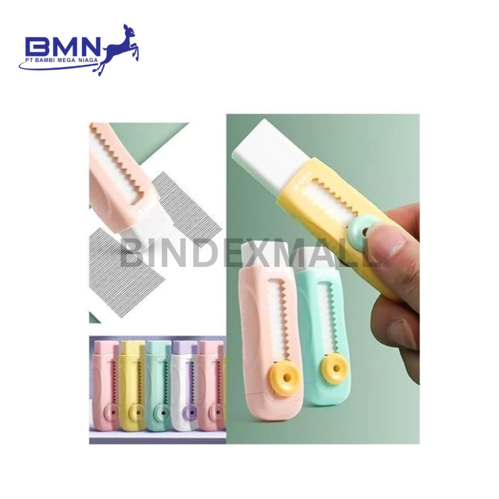 Pertama-tama, penghapus ini memiliki bentuk unik menyerupai mini cutter yang sangat eye-catching. Desain ini bukan hanya untuk gaya, tetapi juga memberikan fungsi praktis yang luar biasa. Anda bisa memegang penghapus dengan nyaman dan presisi tinggi saat menghapus tulisan atau sketsa. Selain itu, mekanisme push-up memudahkan Anda mengatur panjang penghapus yang keluar, sehingga lebih hemat dan tahan lama.