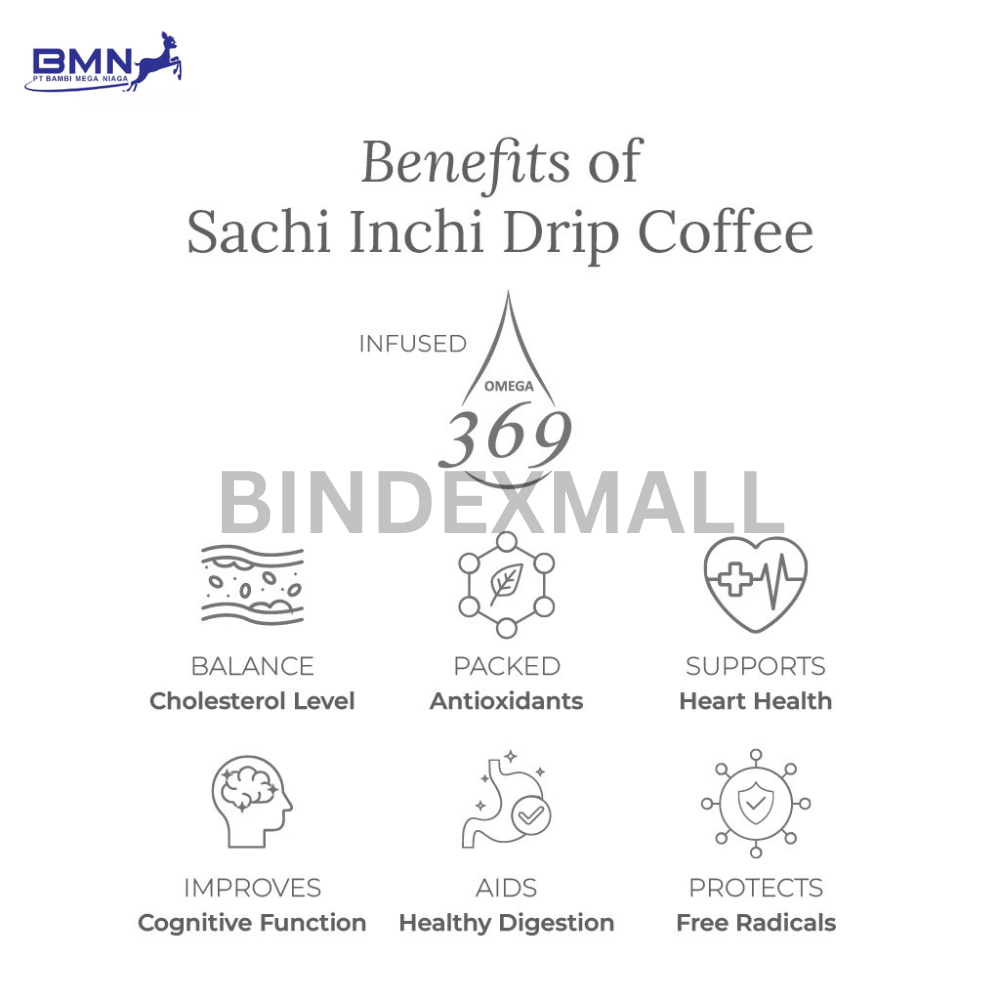 Sacha Inchi Oil Drip Coffee Premium adalah perpaduan sempurna antara kopi berkualitas tinggi dan nutrisi superfood dari minyak Sacha Inchi. Dengan kemasan praktis yang berisi 10 sachet drip, Anda dapat menikmati kopi aromatik yang kaya rasa sekaligus memperoleh manfaat omega-3 dalam setiap tegukan. Produk ini cocok bagi Anda yang ingin menikmati kopi harian namun tetap menjaga kesehatan tubuh.