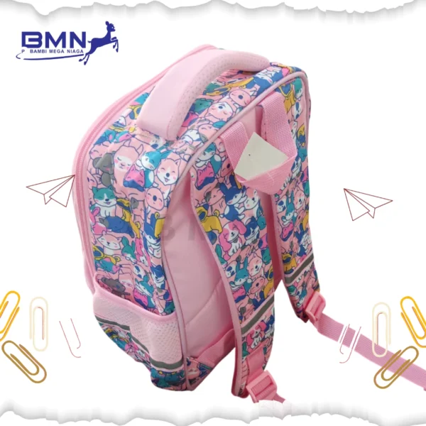 Detail dimensi 44 × 30 × 13 cm membuatnya menjadi Medium Size yang cukup besar untuk kebutuhan SD–SMP, namun tetap nyaman dan proporsional di punggung anak perempuan. Aksen ilustrasi pug yang ceria menambah kepercayaan diri dan jadi pemantik obrolan seru dengan teman-teman di kelas.